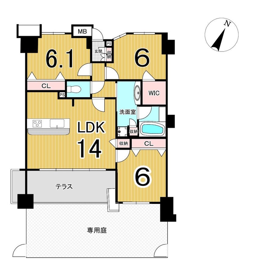 また、1階のお部屋になり庭も広くあるため戸建て感覚でお住まい頂けるかと思います。